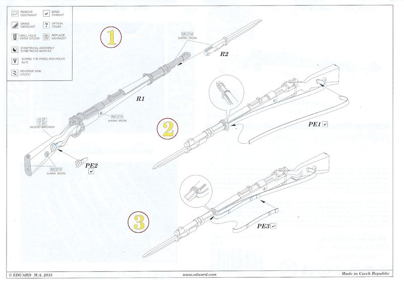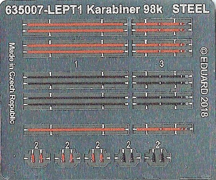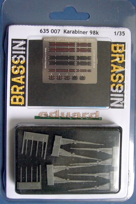 Bausatz: Die Firma Eduard steigt in der Brassin Serie mit dem 98k nun auch in den Maßstab 1:35 ein. In einem Klarsichtblister findet man insgesamt acht sehr schön gestaltete Gewehre und dazu passende Seitengewehre, die so gestaltet sind, dass man diese wie beim Original vorne unter dem Lauf einklinken kann. Zusätzlich liegt ein bunt bedruckter Ätzteilesatz mit passenden Gewehrriemen bei von denen sechs in braunem und zwei in schwarzem "Leder" ausgeführt sind.