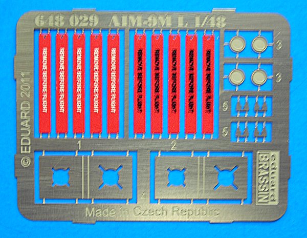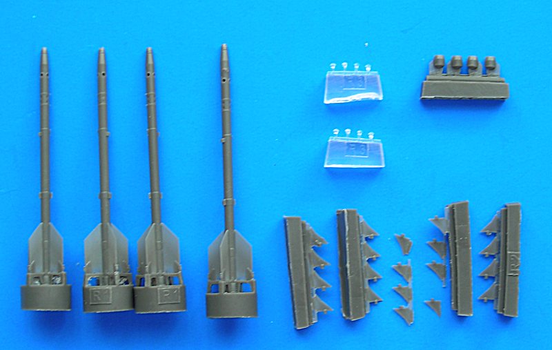 Etwas Sorge bereiten mir die extrem dünn gegossenen Leitwerke. Hier muss man mit großer Vorsicht zu Werke gehen, damit man diese nicht beim Abtrennen beschädigt. Weiterhin liegen Schutzkappen für die Optiken bei, die auch mit RBF-Flags versehen werden können. Diese befinden sich fertig bedruckt (in zwei Varianten) zusammen mit den Brennkammerabdeckungen auf dem kleinen Ätzteilbogen.