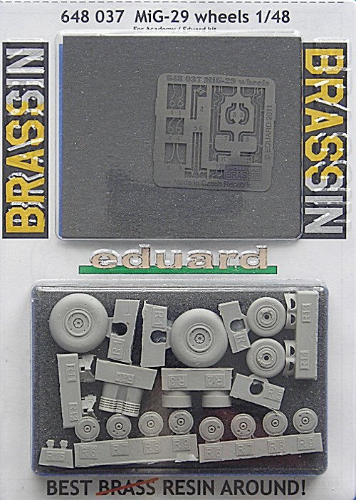 Die Brassin Reihe von Eduard hat sich mittlerweile etabliert und der Hersteller aus Obrnice weiß diese Linie geschickt einzusetzen. Für den Academy-Bausatz der MiG-29A bringt Eduard nun diesen Detailsatz heraus. Er ergänzt auch die eigene Limited Edition des Bausatzes (siehe hier). Der Titel des Bausatzes ist ein wenig irreführend, denn hier werden nicht nur die Räder geliefert, sondern noch weitere Teile zur Detaillierung des Fahrwerks
