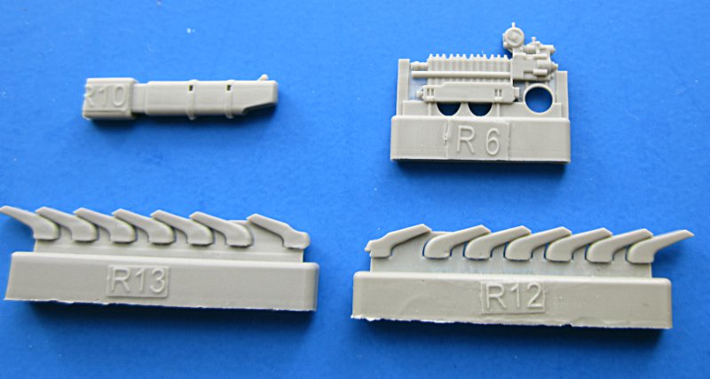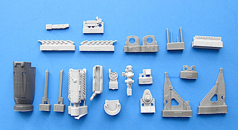 Der Guss der Teile ist - wie inzwischen gewohnt - von sehr guter Qualität. Die Angüsse verhindern einen Bruch in der Verpackung, sind aber leicht von den Teilen zu trennen und bisher hat sich das Material auch immer als ausreichend widerstandsfähig erwiesen, so dass es nach dem Abtrennen nicht so leicht zu einer Beschädigung kommt. Der vordere Auspuffstutzen liegt noch einmal separat bei, falls man den Motor in die Verkleidung eingebaut zeigen möchte, also nicht die komplette Motorverkleidung öffnet oder den Motor separat darstellt. Falls man den Motor in die Verkleidung baut, muss mann den ersten der 6 Resinstutzen abtrennen und den am gleichen Anguss befindlichen "eingedellten" Stutzen einkleben.
