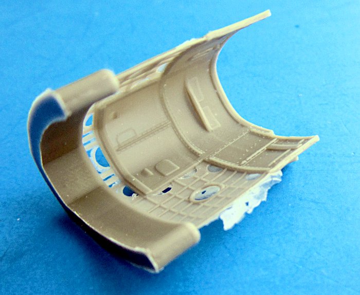Für den Anguss am Brandschott muss man schwereres Geschütz auffahren. Ich empfehle hier die Tamiya Craft Saw, mit der ich sehr gute Erfahrungen gemacht haben, aber es tut fast jede Modellsäge. Man muss allerdings auf einen geraden Schnitt achten! Bei der sehr dünnen Verkleidung und den meisten anderen Teilen reicht der Einsatz eines Skalpells oder einer PE-Säge (z.B. Hasegawa Trytool) bzw. Rasierklingensäge (z.B. JLC, CMK).