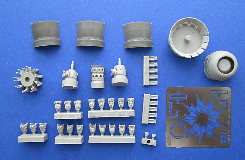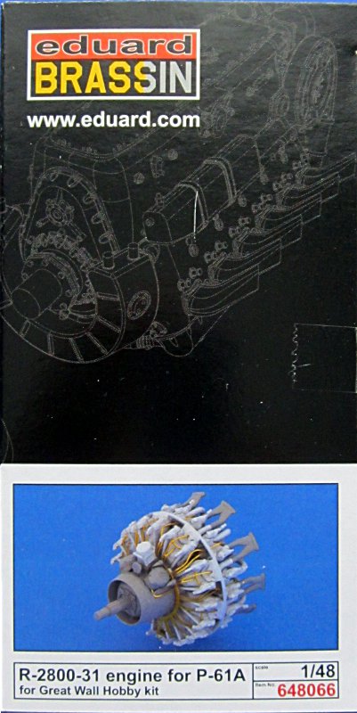 Bausatz: Für die Bausätze der P-61 "Black Widow" von Great Wall Hobby(First Look) hat Eduard ein Resindetailset für einen Motor herausgebracht. Das Set enthält 40 Resinteile und einen kleinen Fotoätzteilbogen. Neben den sehr gut reproduzierten Resinteilen für den Motor gibt es auch mehrere für die Motorhaube. Diese ersetzen die auszusägenden Bausatzteile. Außerdem kann man aus zwei Optionen für das Getriebegehäuse wählen.