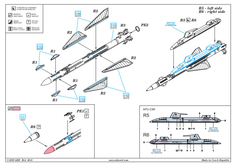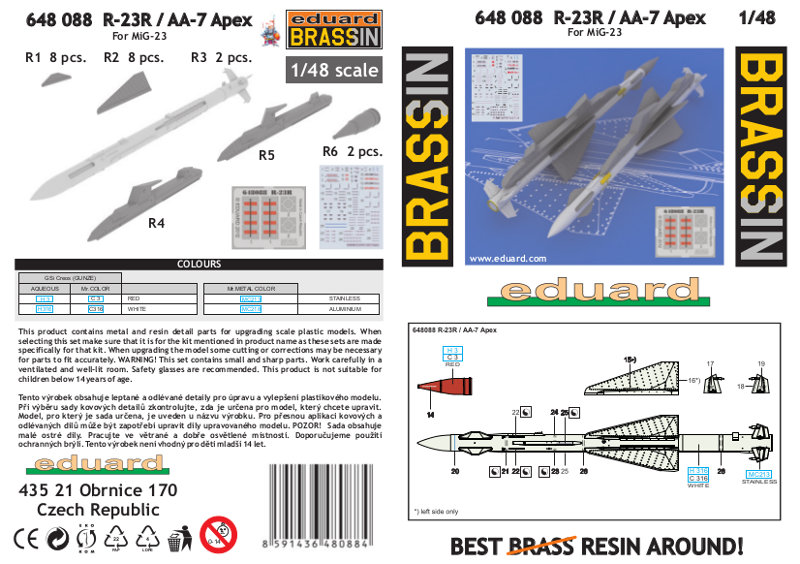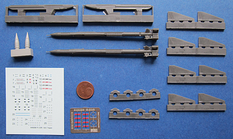 Bausatz: Eduard zieht hier wieder alle Register, die das Material hergibt. Zwei R-23R einschließlich Pylonen für die MiG-23 lassen sich aus dem Satz bauen. Der Raketenkörper ist super gegossen und weist feine Details auf. Der Anguss beschränkt sich auf den "Boden" der Rakete. Die Raketenkörper sind diesmal vollständig und nur ein kleiner PE-Ring wird am Boden als Triebwerksauslass angeklebt. An der Spitze befindet sich ein kleiner Steiger, der vorsichtig abgetrennt werden muss, damit der Suchkopf spitz bleibt. Will man die Abdeckung verwenden, muss der Gefechtskopf an einer Stelle abgesägt werden und stattdessen die Schutzkappe aufgeklebt werden. Die Steuerflächen sind ausgesprochen dünn aber trotzdem "bruchsicher". Sie werden in Verteifungen im Raketenkörper eingeklebt. Seit einiger Zeit gibt es in den Brassinsätzen auch Hinweise zur Farbgebung der Raketen und der Pylone und sogar Decals sind im Satz und deren Anbringung in der Bauanleitung erläutert... super!