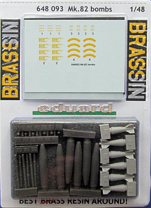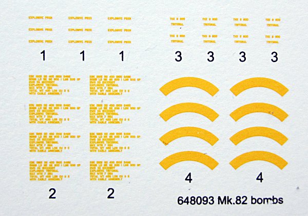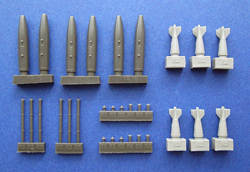 Bausatz: Eduard liefert hier die normale Freifallbombe mit glattem Metallkörper und Standardleitwerk. Sechst Bombenkörper und Leitwerke liegen bei. Dazu gibt es 3 mögliche Aufschlagzünder. Der Bombenkörper ist super gegossen und weist die notwendigen Details auf. Der Anguss beschränkt sich auf den „Boden“ der Rakete. Allerdings muss der Bombenkörper mit dem Leitwerk geau ausgerichtet werden. Eine Abbildung der korrekten Position ist in der Bauanleitung enthalten.Diese enthält auch Hinweise zur Farbgebung und sogar Decals zur Gestaltung der Bomben sind im Satze bzw. der Bauanleitung. Vorgesehen ist eine Farbgebung in Olive Drab.