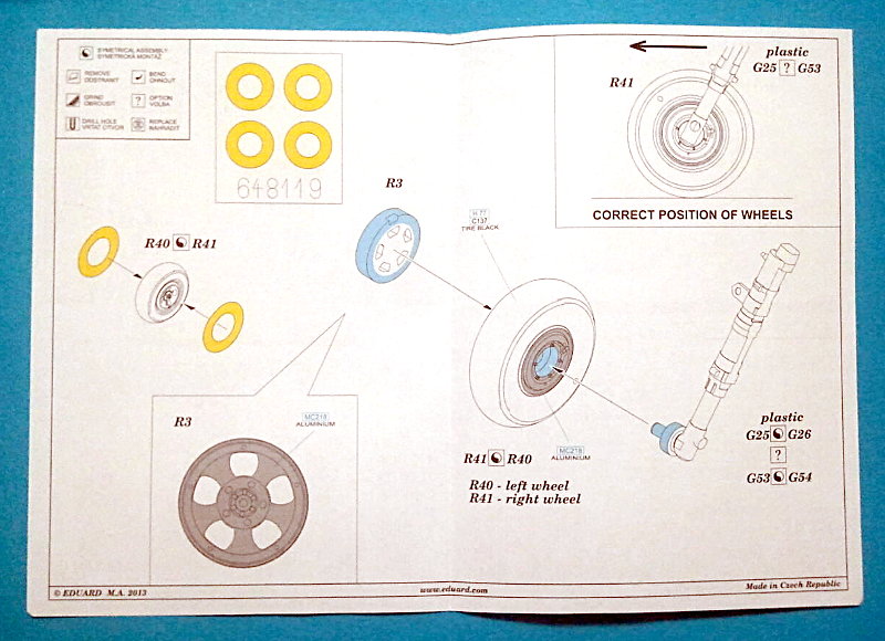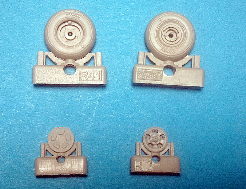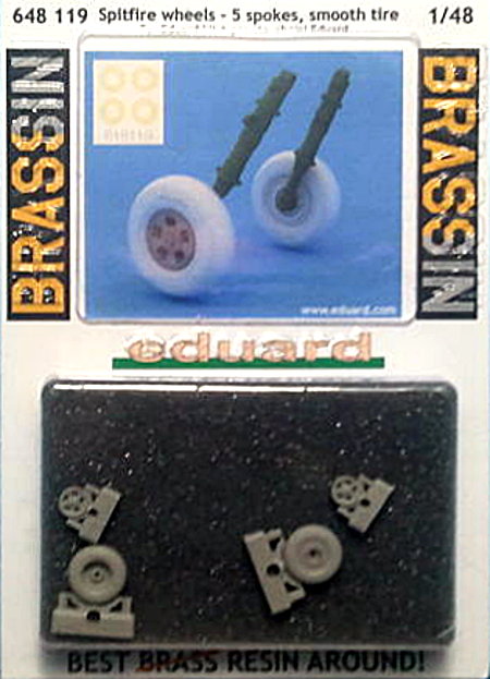 Das hier zu besprechende Set ersetzt die Räder des hauseigenen Spitfire Mk. IX Bausatzes als drop-in, wobei hier ein glattes Profil dargestellt ist,. Die Reifen sind nicht abgeflacht. Auf den Flanken findet sich der Reifenhersteller erhaben aufgeprägt (etwas zu stark für meinen Geschmack, aber wozu gibt es Schleifpapier), die separaten 5-Loch-Felgen sind durchbrochen und mit einer hinter den Speichen angedeuteten Bremsscheibe versehen. Um das Bemalen der Felgen zu vereinfachen, hat Eduard Masken aus Kabuki-Tape beigelegt.