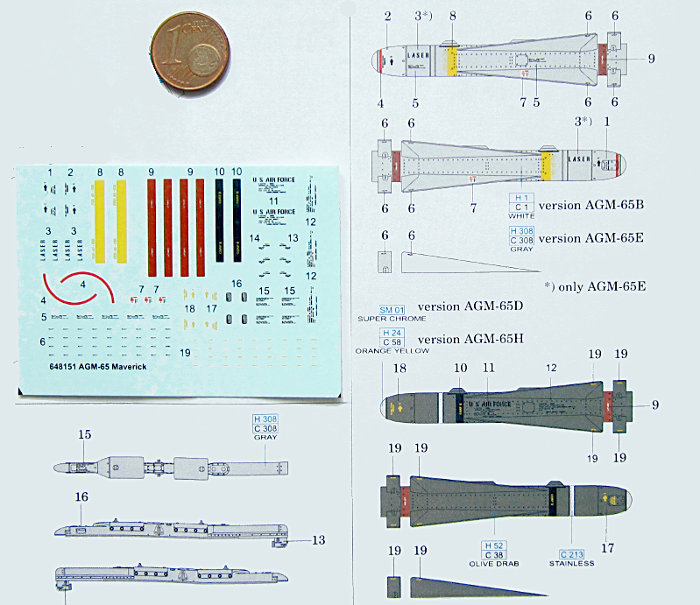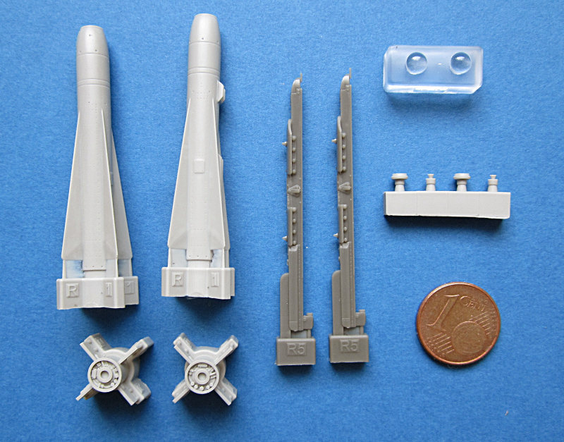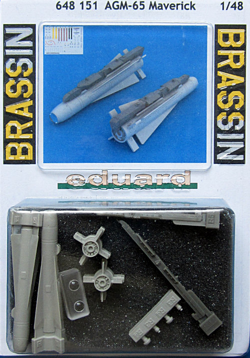 Bausatz: Eduard erweitert in seiner Brassin-Reihe ständig das Angebot an modernen Abwurfwaffen. Dabei sind amerikanische und sowjetische bzw. russische Systeme aufgrund der weiten Verbreitung natürlich der Schwerpunkt. Nach verschiedenen Bomben gibt es mit der Maverick auch mal eine amerikanische Luft-Boden-Rakete. Im Bausatz befinden sich Teile für zwei Modelle dieses Flugkörpers sowie zwei Startschienen. Schon fast gewohnt ist die Aufteilung in Raketenkörper, Heck mit Steuerwerk und Düse und die Visiereinrichtung. Letztere liegt in zwei Varianten bei: AGM-65B (TV) und AGM-65E (Laser). Durch die Bemalung sind weitere Varianten darstellbar.