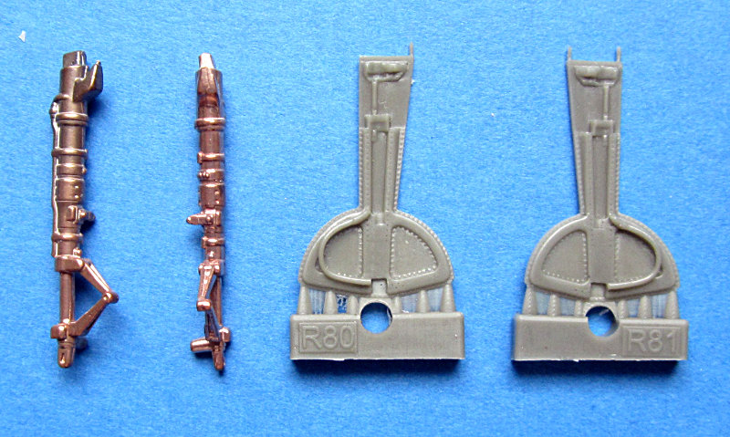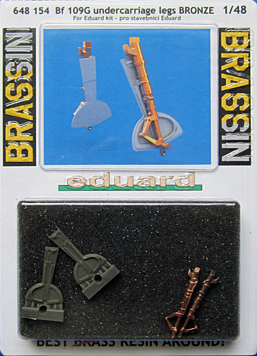 Eduard bring für seine hauseigene Bf 109G-6 (First Look bzw. First Look) ein Set mit Fahrwerksbeinen und -klappen heraus. In der noch recht jungen "Bronze"-Linie schafft es der tschechische Hersteller Details und Stabilität zu vereinen. Der Satz besteht aus zwei dünnen, gut detaillierten Fahrwerksklappen aus Resin und zwei Fahrwerksbeinen aus Metall. Die Klappen haben einen Teil der flexiblen Bremsleitung angegossen, der Rest findet sich an den Beinen und ist nicht ganz so starr dargestellt wie am Plastikfahrwerk.
