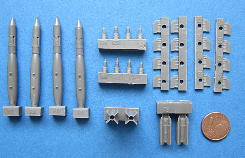 Bausatz: Eduard liefert hier den glatten Metallkörper mit angegossenem Paveway-Lenkkopf. An diesen müssen noch die Leitwerke und der Steuerkopf angeklebt werden. Letzterer liegt in zwei Versionen bei. Vier Bombenkörper und Leitwerke liegen bei. Der Bombenkörper ist super gegossen und weist die notwendigen Details auf. Der Anguss beschränkt sich auf den „Boden“ der Bombe. Allerdings muss der Bombenkörper mit dem Leitwerk genau ausgerichtet werden. Letzteres ist separat gegossen. Dies macht für den Hersteller Sinn, da es verschiedene Ausführungen dafür gibt.