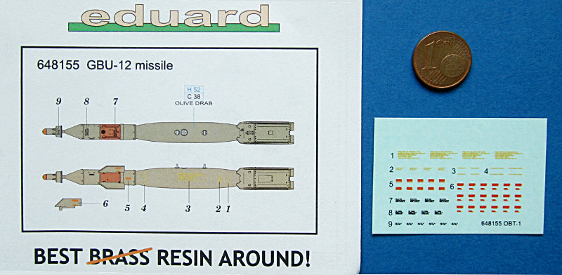 Zur korrekten Ausrichtung ist eine Verzahnung des Leitwerks mit dem Bombenkörper vorgesehen. Allerdings befindet sich genau hier der Anguss der Leitwerksteile. Wie sich Eduard das Abtrennen des Blockes ohne Beschädigung der Leitwerksfinnen vorstellt ist mir nicht ganz klar. Wahrscheinlich ist es am Besten, den Block erst mal mit etwas Abstand abzusägen und den Rest dann auszubohren. Die Bauanleitung enthält Hinweise zur Farbgebung und sogar Decals zur Gestaltung der Bomben sind im Satze bzw. der Bauanleitung. Vorgesehen ist eine Farbgebung in Olive Drab.