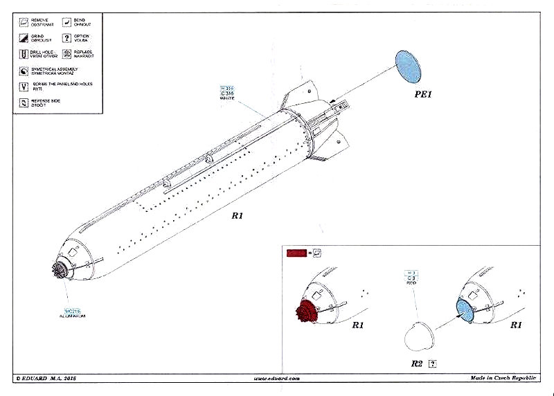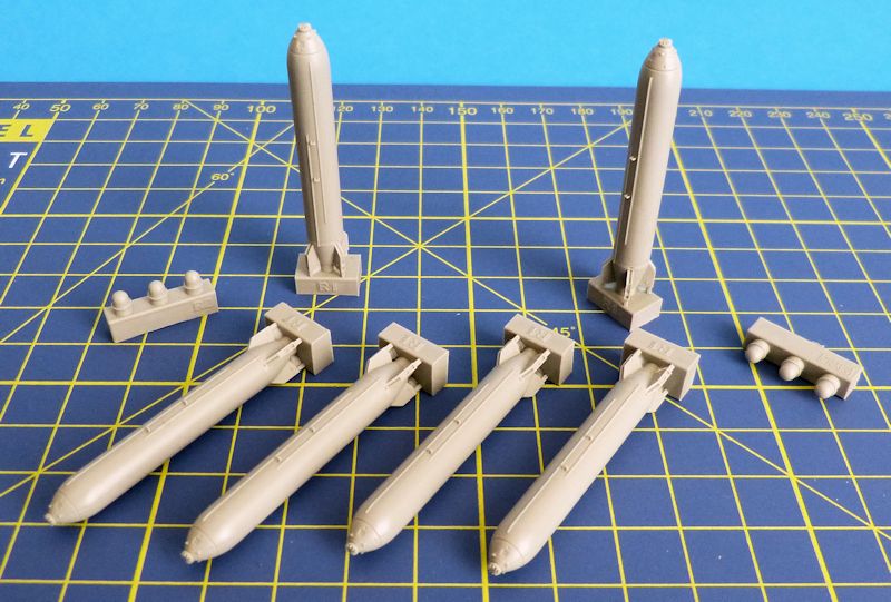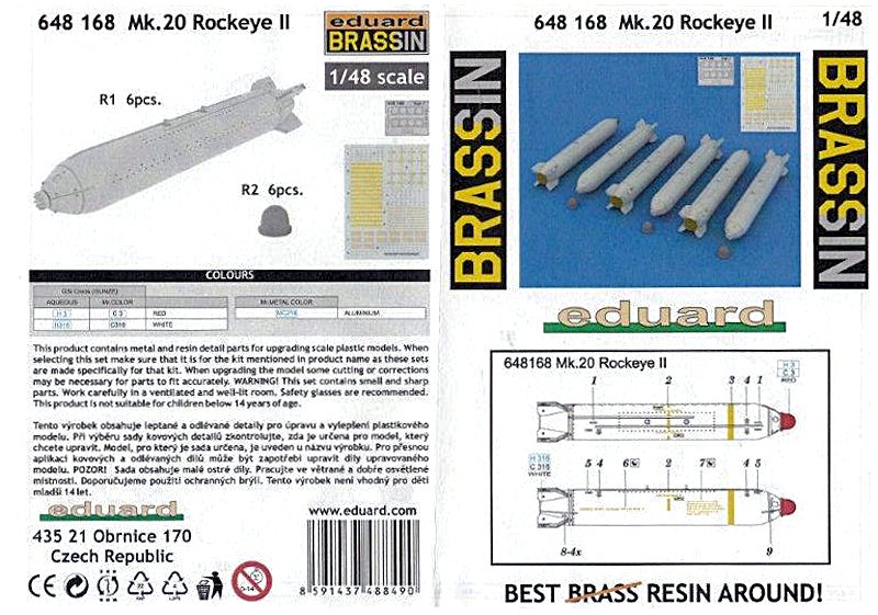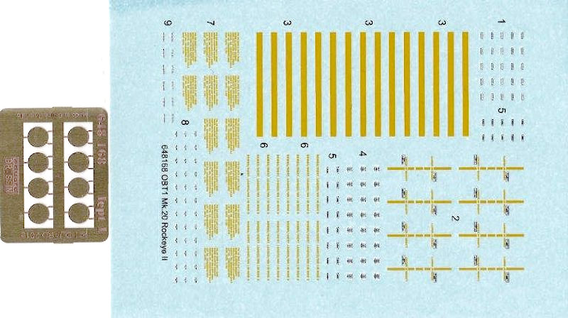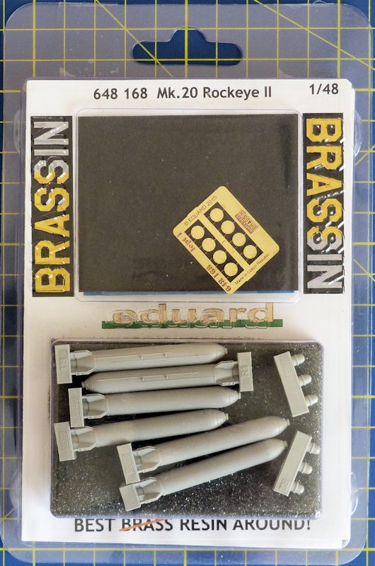 Bausatz: In der durchsichtigen Plastikverpackung befinden sich sechs Mk.20 Rockeye II Nachbildungen. Für diese gibt es sechs Schutzkappen für den Sensor, eine kleine Ätzteilplatine und ein Decalbogen. Der Resinguss ist hervorragend. Die Angüsse sollten sich mit etwas Vorsicht gut entfernen lassen. Die runden Ätzteile werden am Heck der Waffe mit Sekundenkleber angeklebt. Möchte man die Schutzkappen an den Streuwaffenbehälter anbringen, müssen die vorderen Sensoren abgeschnitten(gesägt) werden.