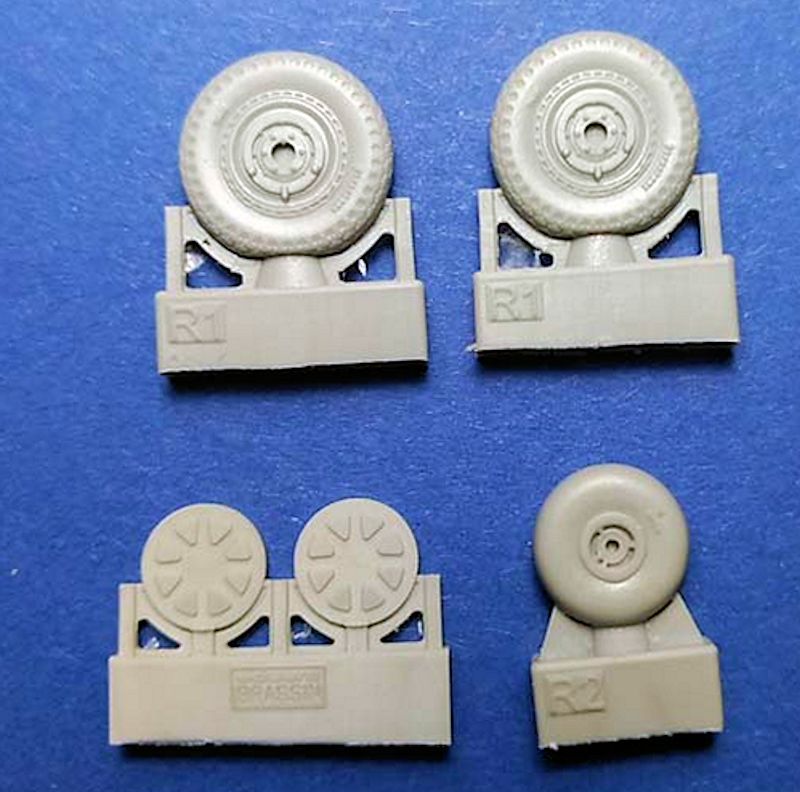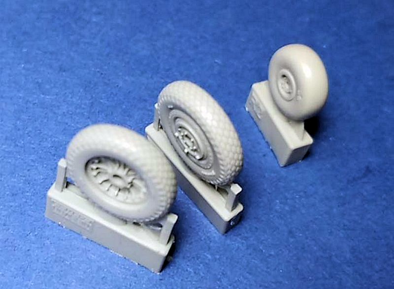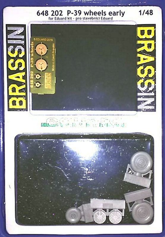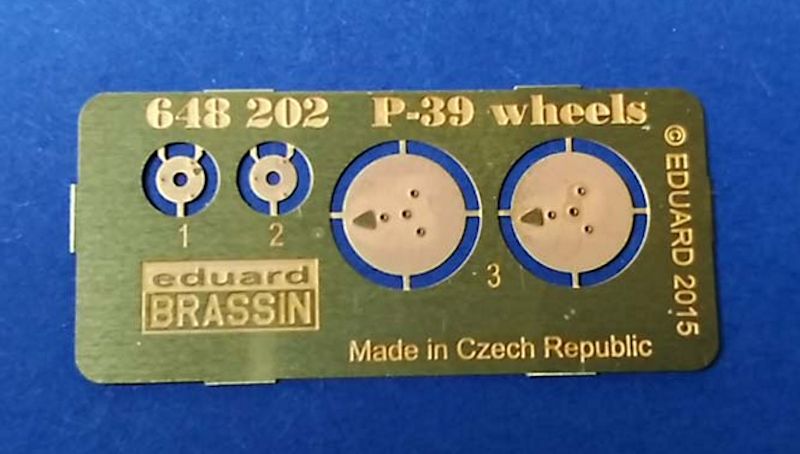 Eduard hat zur Aufwertung seiner Airacobra-Bausätze zwei Sets Resin-Räder herausgebracht. Im "early"-Set gibt es zwei abgeflachte Haupträder mit rundem Reifenquerschnitt und ein ebenfalls abgeflachtes Bugrad mit kleiner Felge. Die Haupträder weisen ein ausgeprägtes Stollenprofil und feine Details der Felgen auf. Die Speichen sind zwar durchbrochen, müssen jedoch von Fischhaut befreit werden. Für geschlossene Felgen liegen Ätzteile zur Abdeckung bei. Zur Vereinfachung der Bemalung gibt es Maskierfolien aus Kabuki-Tape.