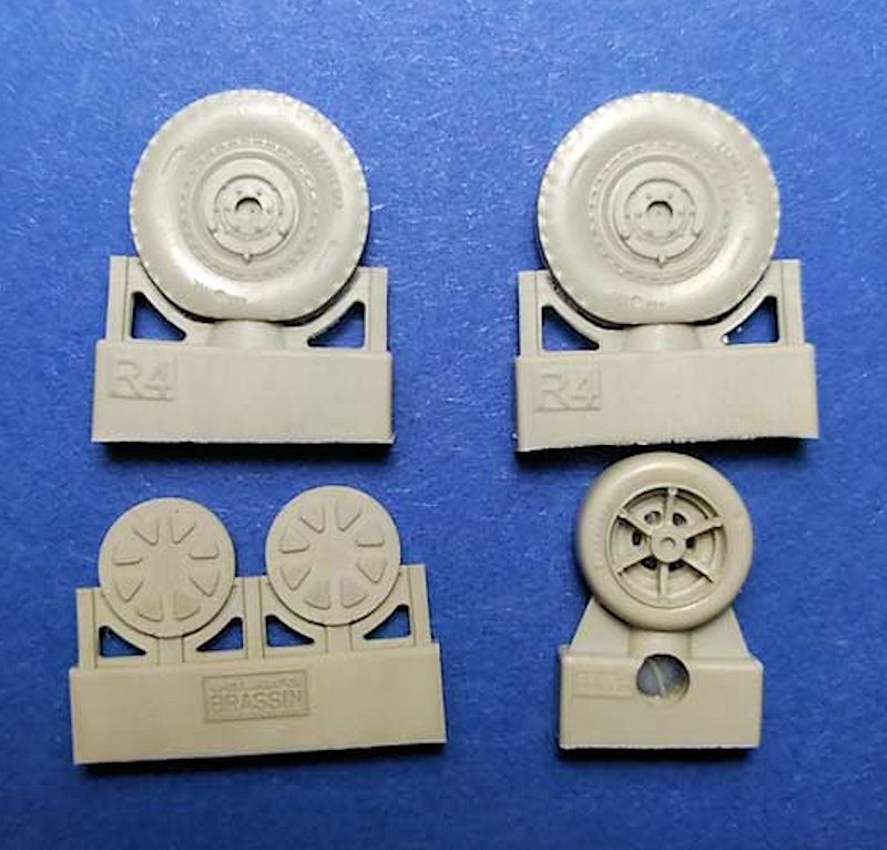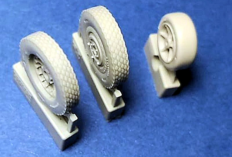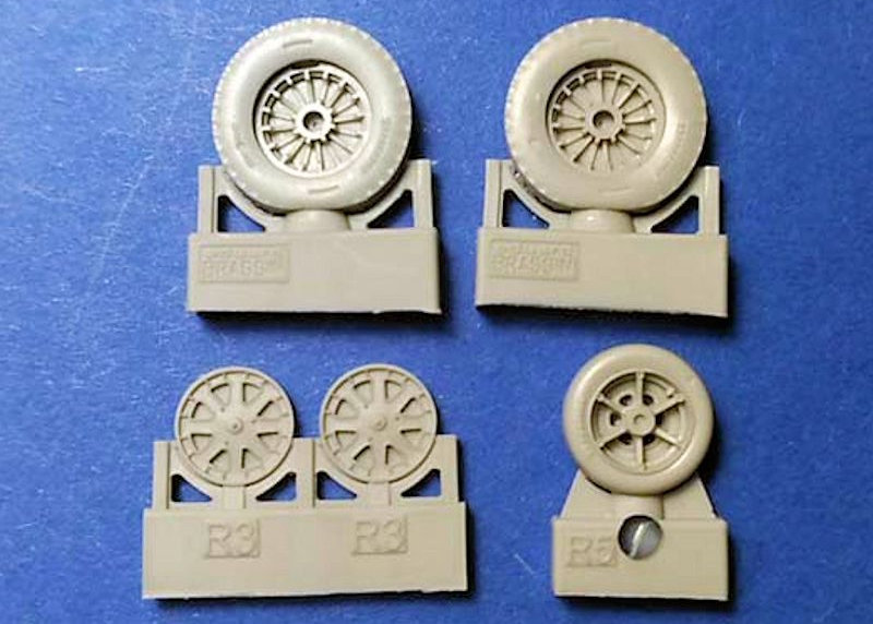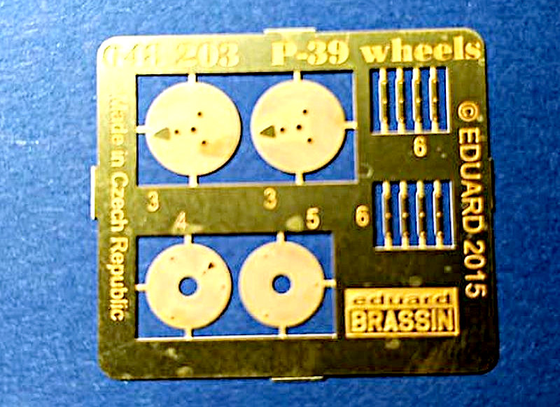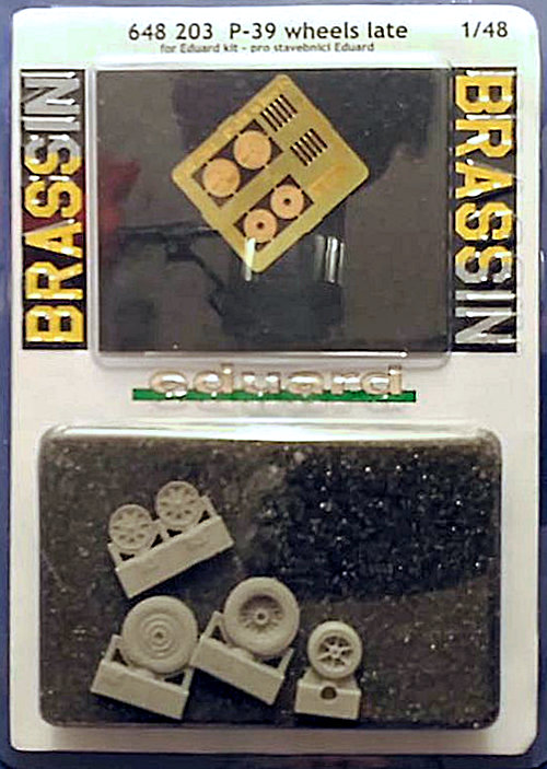 Eduard hat zur Aufwertung seiner Airacobra-Bausätze zwei Sets Resin-Räder herausgebracht. Im "late"-Set gibt es zwei abgeflachte Haupträder mit eckigem Reifenquerschnitt und ein ebenfalls abgeflachtes Bugrad mit großer Speichenfelge. Die Haupträder weisen ein ausgeprägtes Stollenprofil und feine Details der Felgen auf. Die Speichen sind zwar durchbrochen, müssen jedoch von Fischhaut befreit werden. Für geschlossene Felgen liegen Ätzteile zur Abdeckung bei. Für das Bugrad gibt es außerdem drei schmale Streben, die um die Felge herum platziert werden sollen. Zur Vereinfachung der Bemalung gibt es Maskierfolien aus Kabuki-Tape.