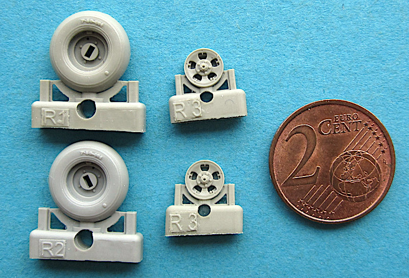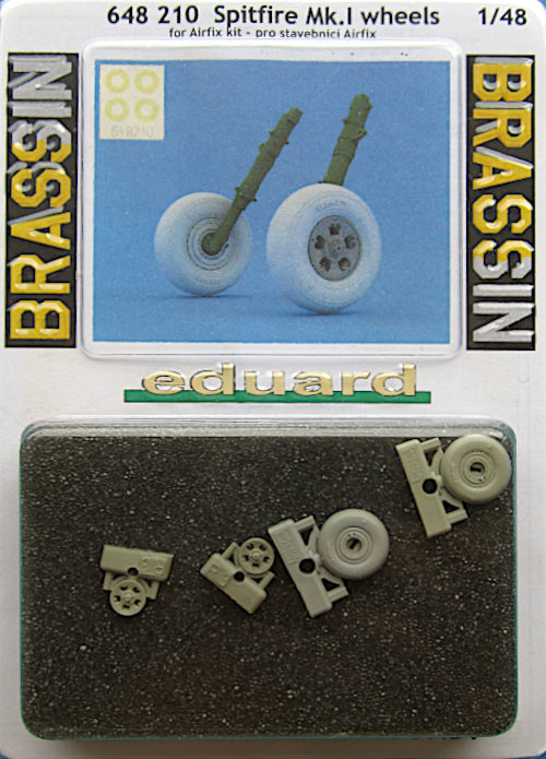 Für die Spitfire Mk.I von Airfix (First Look) hatte Eduard eine ganze Reihe von Zubehörsets herausgebracht. Darunter drei in der Brassin Linie. Dieser Rädersatz besteht aus zwei nicht abgeplatteten Hauptfahrwerksrädern in grauem Resin ohne Profil, zwei separaten Fünfloch-Felgen und einem kleinen Maskenbogen für die Bemalung. Der Schriftzug (wahrscheinlich die Reifenmaße) auf den Flanken ist leider nicht gut lesbar. Eine leichte Abplattung der Reifen kann man mit ein paar Schleifzügen an der Angussstelle erreichen