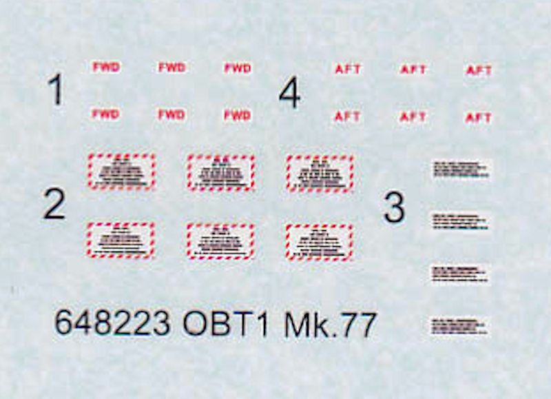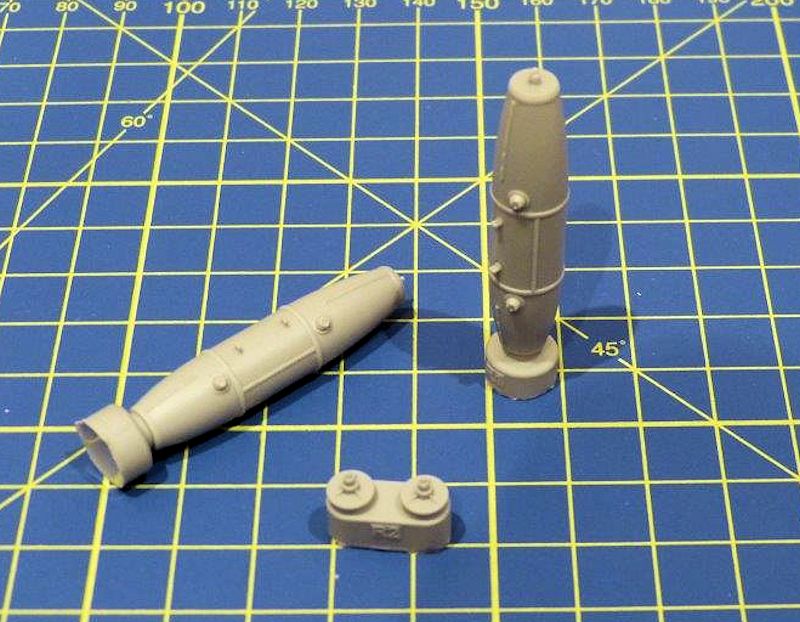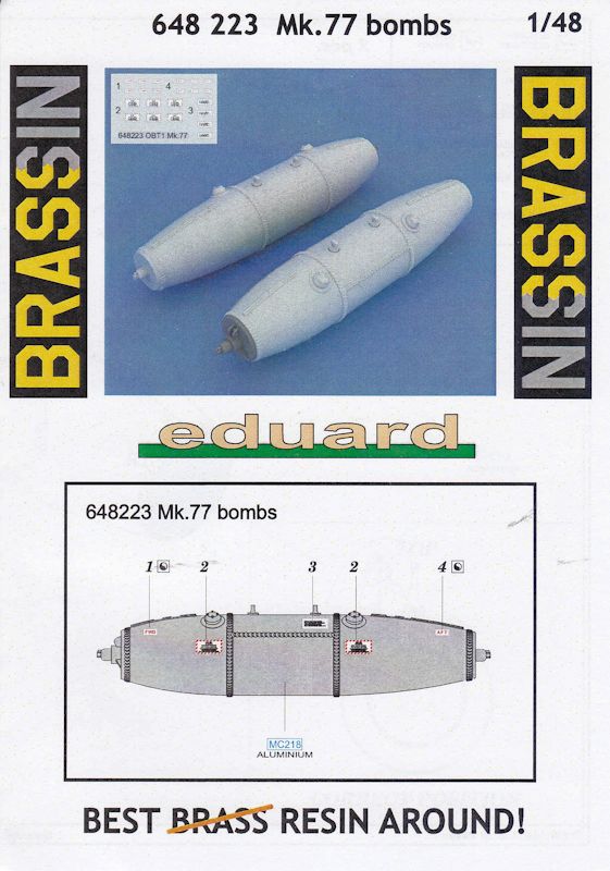 Bausatz: Mit den MK-77 Brandmittelbomben, erweitert Eduard Brassin seine hervorragende Serie moderner Waffensysteme im Maßstab 1:48 für die US Luftwaffe. In der Durchsichtigen stabilen Plastikverpackung befinden sich zwei Bombenkörper und zwei Abdeckungen. Die Detaillierung lässt nichts zu wünschen übrig. Die Angüsse müssen entfernt werden. Des Weiteren findet sich in der Verpackung ein kleiner Decalbogen. Die Anbringung der Decals und deren Position, werden im Beiblatt erläutert.