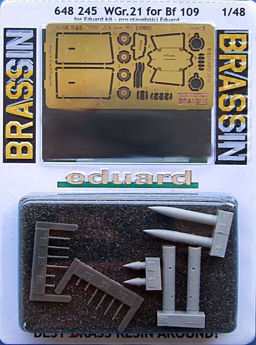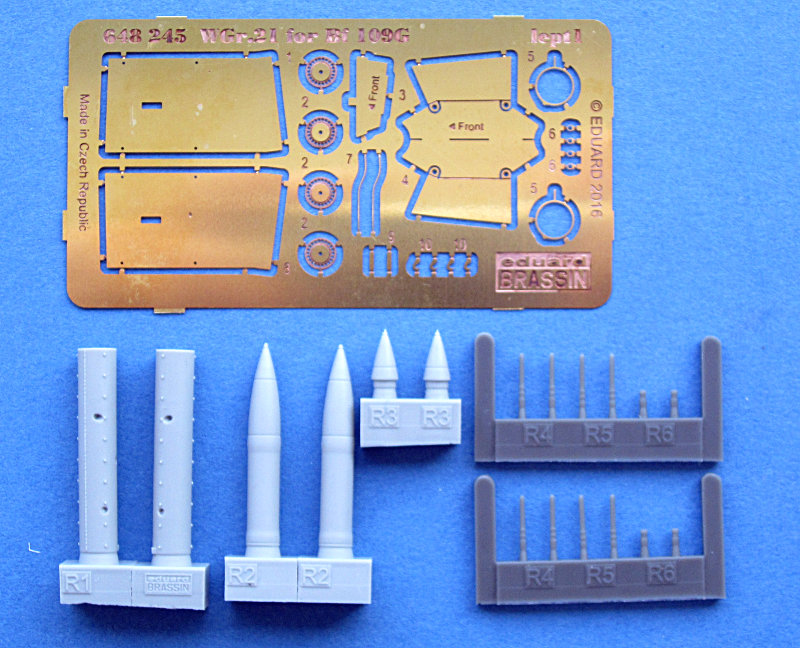 Für die eigen neue Bf 109G-Reihe von 2016 (Bf 109G-6 late First Look) hat Eduard neben Masken und Fotoätzteilen auch ein breites Portfolio an Resinzubehörsätzen im Programm. Die Brassin Produktlinie dürfte inzwischen bekannt sein und bedarf wohl keiner Einführung. Für die Bf 109G-6 möchte ich hier den Detailsatz für die Wurfgranate 21 vorstellen.