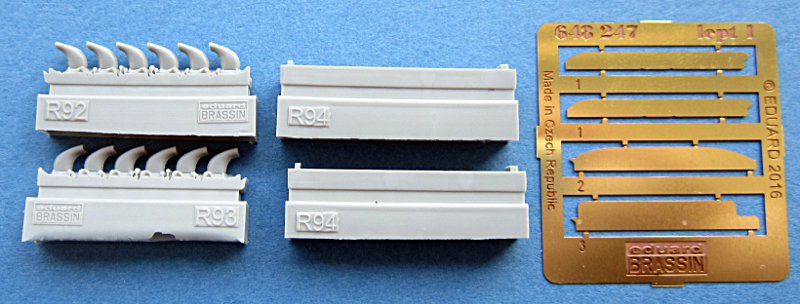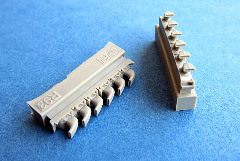 Mal wieder ein wohldurchdachter Satz von Eduard. Die Auspuffstutzen des Bausatzes sind ja bereits hohl gegossen und somit eigentlich für die meisten Zwecke völlig ausreichend. Allerdings muss man sie bereits frühzeitig einbauen. Natürlich sind diese Resin-Abgasstutzen eine Nummer feiner detailliert als die Plastikteile, der wirkliche Vorteil liegt aber darin, dass zunächst ein Einbaurahmen von hinten gegen die Bausatzöffnungen für die Stutzen geklebt wird und dann die Reihe von außen eingeklebt wird. Mit etwas Vorsicht kann man dies auch am fertigen Modell machen. Gut ist ebenfalls, dass die Leitbleche beidseitig für oberhalb und unterhalb der Auspuffstutzen beiliegen. Auch hier ein Blick in die Bauanleitung (pdf).