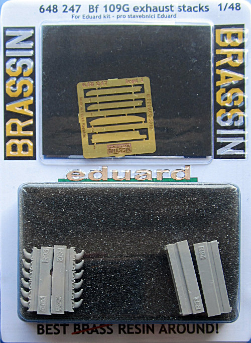 Für die eigen neue Bf 109G-Reihe von 2016 (Bf 109G-6 late First Look) hat Eduard neben Masken und Fotoätzteilen auch ein breites Portfolio an Resinzubehörsätzen im Programm. Die Brassin Produktlinie dürfte inzwischen bekannt sein und bedarf wohl keiner Einführung. Für die Bf 109G-6 möchte ich hier den Detailsatz für die Auspuffstutzen vorstellen.