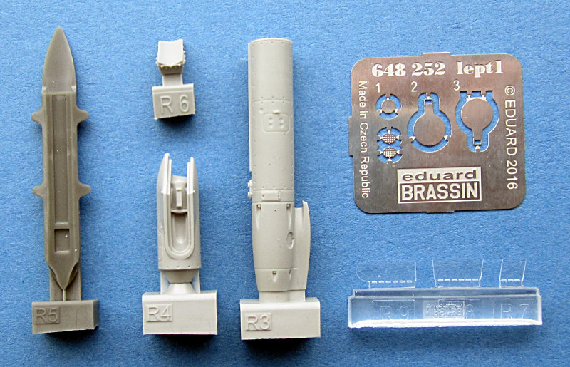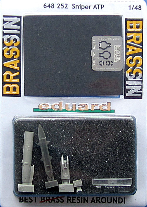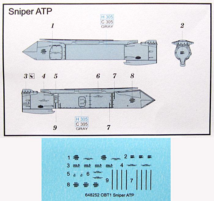 Bausatz: Der Zielerfassungs- und -verfolgungsbehälter wird aus 3 grauen und 3 klaren Resinteilen, sowie einigen Fotätzteilen aufgebaut. Außerdem gibt es noch einen Träger für den Behälter, mit dem dieser an einem Pylon befestigt werden kann. Der Zielkopf kann somit in "verstauter" (Optikfenster nach oben) und aktiver Position dargestellt werden. Der Guss ist wie immer makellos. Eine Bemalungsanleitung und entsprechende Decals runden den Satz ab.