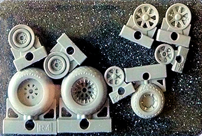 Die komplette Bereifung kann mit Speichenfelgen versehen werden. Für das Hauptfahrwerk gibt es zusätzlich auch geschlossene Felgen. Die Radkappen liegen als Photoätzteile bei. Die Detaillierung ist vorbildlich. Die Felgenstruktur ist bis in die Tiefe hinein aufs Feinste herausgearbeitet. Auch der Goodyear-Schriftzug fehlt nicht. Die Reifen sind allerdings nicht abgeplattet!
