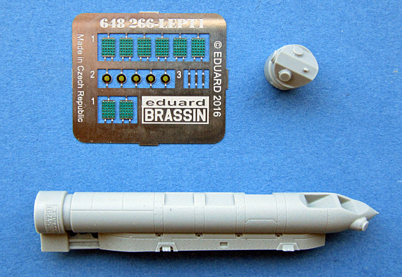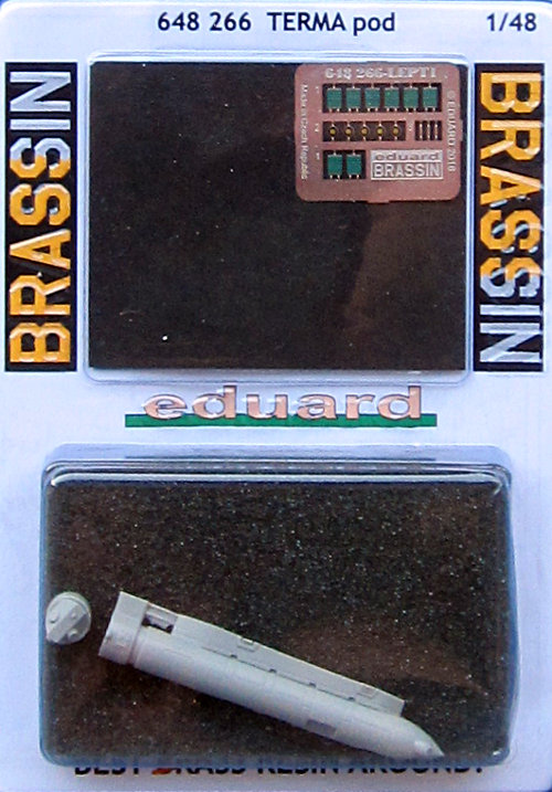 Bausatz: Eduard hat diesen Pod zweiteilig in Resin abgegossen, wobei der Pylon für die oben genannte Verwendung bereits angegossen ist. Die Abdeckungen für die Ausstoßbehälter der Täuschkörper werden mittels farbig bedruckten Fotoätzteilen nachempfunden, ebenso einige Sensoren. Ansonsten ist der Pod grau. Decals liegen nicht bei.