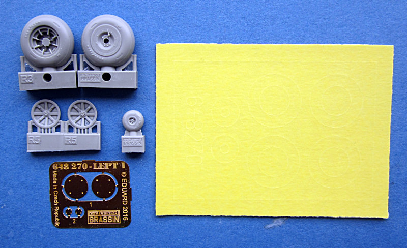 Dieser Satz erlaubt den Austausch der Räder des Airfixbausatzes. Die Resinteile sind sehr schön gestaltet. Die Räder sind leicht abgeflacht und haben eine Details. Unter Anderem die Herstellermarkierungen (GoodYear für die Huptfahrwerksreifen, Firestone beim Spornrad). Die Räder können mit einem Speicheneinsatz oder mit Fotoätzteilabdeckungen Verwendung finden. Die Speichenzwischenräume müssen erst noch freigelegt werden, aber dass ist mit einem Skalpell schnell erledigt.