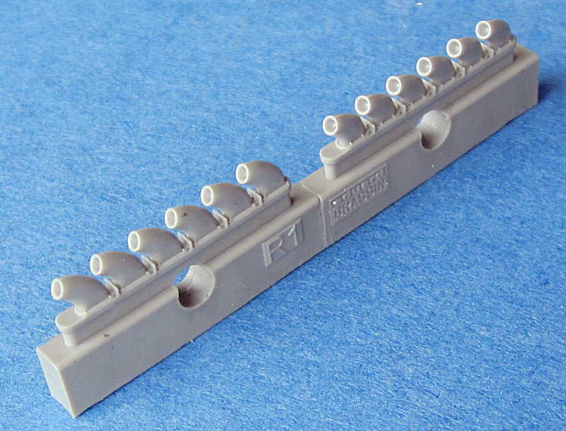 Dieser Satz erlaubt den Austausch der Auspuffstutzen des Airfixbausatzes. Auch hier sind die Resinteile sehr gut ausgeführt. Vor allem sind die Abgasdüsen hohl, was den eigentlichen Vorteil gegenüber den Bausatzteilen ausmacht. Die Teile ersetzen einfach die entsprechenden Bausatzteile. Die Bauanleitung zeigt auf welcher Seite, denn die Teile sind nicht identisch.
