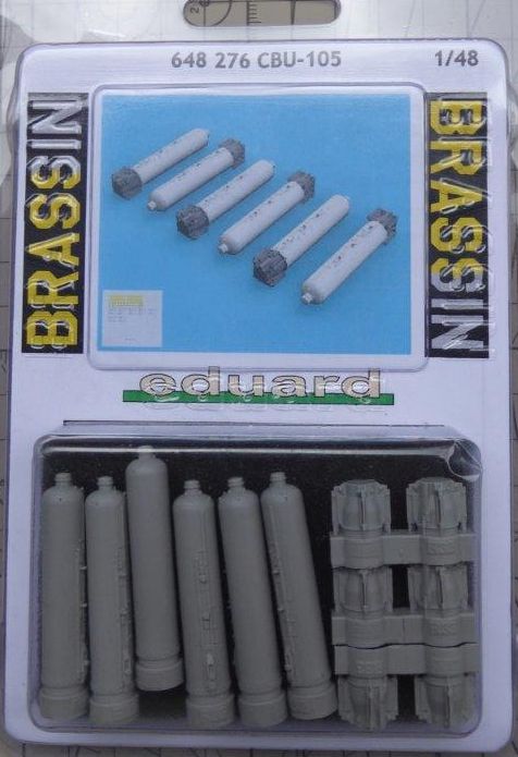 Bausatz: Ein weiterer Streubombentyp mit der Bezeichnung CBU-105 im Maßstab 1/48 erscheint in der Eduard typischen Verpackung für ihre Zubehörsätze. In dieser befinden sich sechs Bombenkörper und sechs Aufsätze die am Heck der Bombe verklebt werden. Auch hier ist am Resinguss nichts zu beanstanden. Auch die Detaillierung der Bombenkörper ist sehr gut.