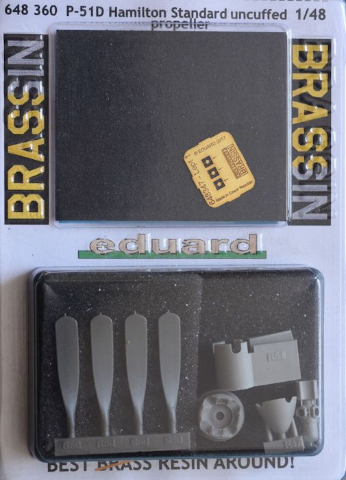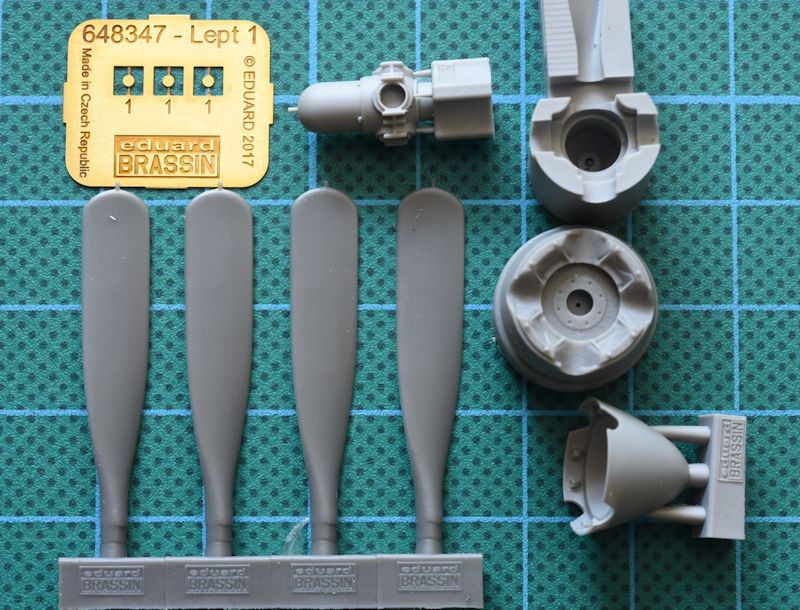 Diese Propellerblatt-Variante kam bei vor allem bei Nachkriegs-Mustangs zum Einsatz. Der Satz besteht aus vier Blätter, vier Spinnerteile und eine Ätzplatine.