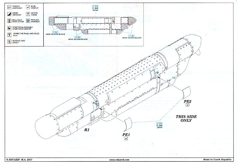 Eduard liefert dieses Zurüstteil wieder in einer hervorragenden Resingussqualität. Dazu kommen außerdem eine kleine Ätzteilplatine, ein Decalbogen und eine kurz Anleitung. In der Anleitung finden sich Lackierhinweise und auch auf die Anbringung der Abziehbilder wird eingegangen.