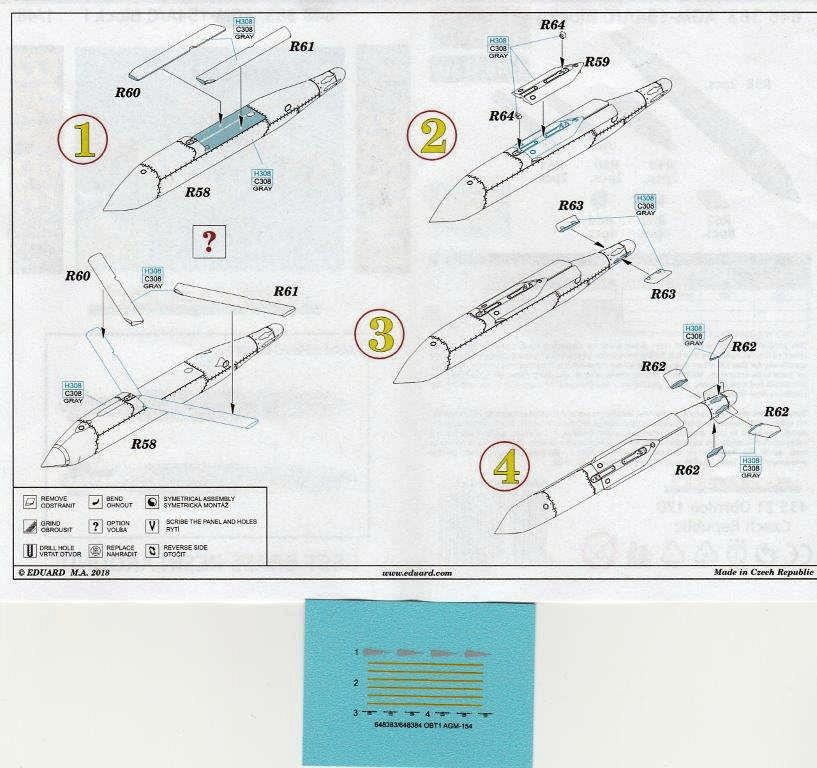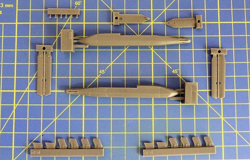 Bausatz: Der Zubehörsatz der Nachbildung der AGM-154A/C befindet sich in der typischen Brassin Faltschachtel. Der Inhalt ist durch zwei Schaumstoffeinlagen sehr gut vor Bruch geschützt. Die Bauteile sind in zwei Klarsichtbeutel verpackt. Alle Teile weisen wieder eine hohe Detailierung auf. Das gilt besonders für die zwei Bombenkörper. Angüsse sind wie immer vorsichtig zu entfernen.