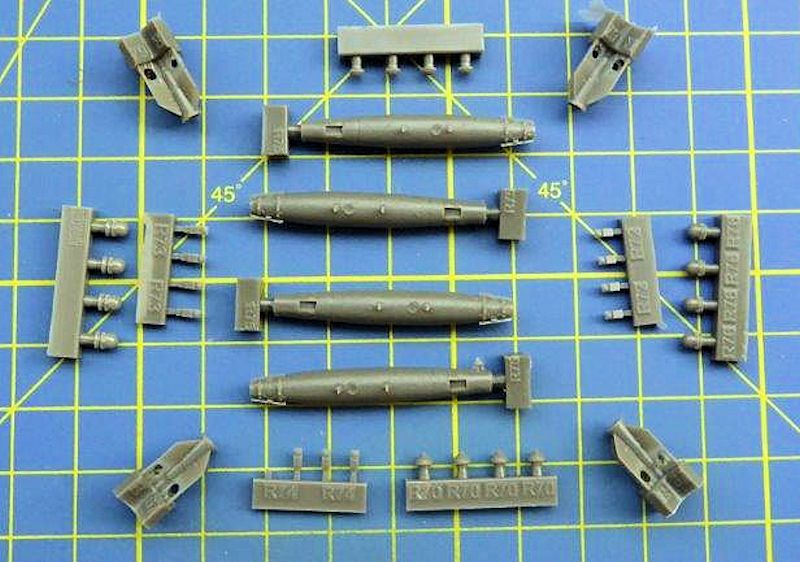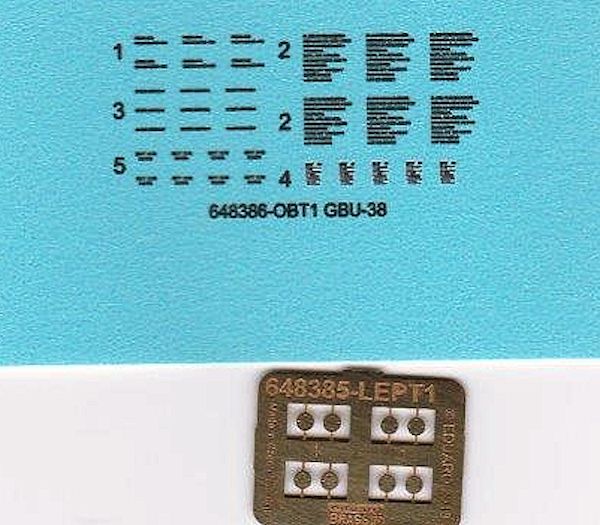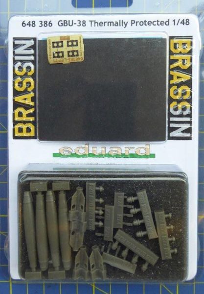 Mit der GBU-38 erweitert eduard Brassin sein reichhaltiges Angebot an modernen Abwurfwaffen im Maßstab 1/48. Er bringt hier eine weitere Variante der GPS gesteuerten GBU-38 Bombe heraus. Bei diesen Detailsatz weißt der Bombenkörper eine gute Nachbildung der aufgetragenen rauen Beschichtung auf. In der Plastikverpackung befinden sich vier Bombenkörper, die separat beiliegenden Stabilisierungsflossen am Heck und vier unterschiedliche Varianten der Aufschlagzünder. Auch finden sich andere Anbauteile in der Verpackung. Es lassen sich drei Versionen (US. Air Force, US. Navy und eine Variante für den B2 Bomber) der GBU-38 bauen. Auf die Unterschiede weißt die umfangreiche Anleitung hin. Mit dem Maskensatz wird der vordere Bereich des Bombenkörpers maskiert. Durch den aufgesetzten GPS Rüstsatz gestaltet sich hier die Lackierung etwas schwierig.