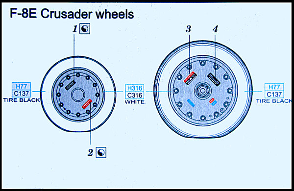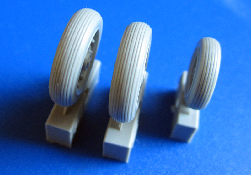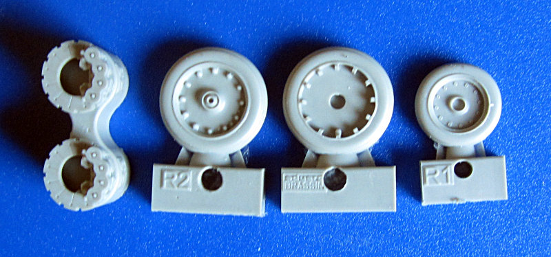 Dieser Satz ersetzt die Räder des Bausatzes. Die 5 Teile sind sauber gegossen. die Bremssättel liegen separat bei. Neben den feinen Details auf den Felgen, zeigen die Reifen ein gut gemachtes Rillenprofil. Wie immer bei Eduards Radsätzen gibt es auch Masken zur Lackierung der Felgen. Diesmal ist auch ein kleiner Decalbogen enthalten, der Wartungshinweise auf den Rädern nachbildet. Eine kleine Anleitung zeigt Farbgebung und Platzierung der Decals.