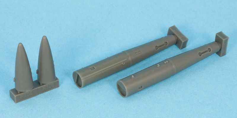 Bausatz: In der durchaus etwas überdimensionierten Verpackung finden sich zwei fein gegossene Bombenkörper, hauchdünne Stabilisierungsflossen (da scheint wirklich das Licht durch!) sowie je nach Variante die passende Bombenspitze.