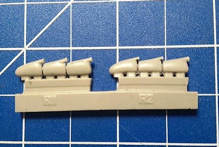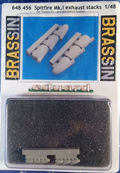 Eduard hat zur Aufwertung der Spitfire Mk. I von Tamiya wie zu erwarten weiteres Zubehör herausgebracht. Dieser Detailsatz ersetzt die kiteigenen Auspuffrohre und besteht aus zwei Auspuffanlagen mit je drei ausgehöhlten Rohren in grauem Resin.