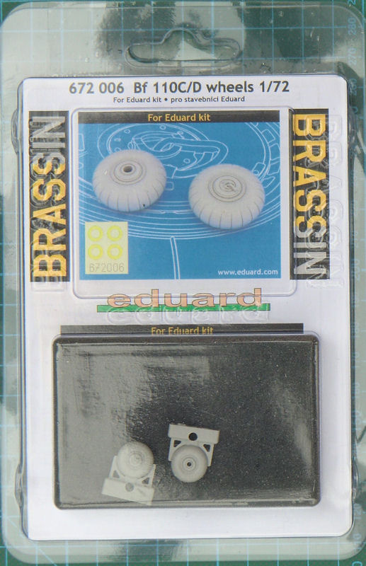 Auch für die hauseigene Messerschmitt Bf 110C/D hat eduard in der BRASSIN-Linie ein Räderset herausgebracht. In der durchsichtigen Verpackung befinden sich gut verpackt zwei Resinteile und ein Set gelber Masken.