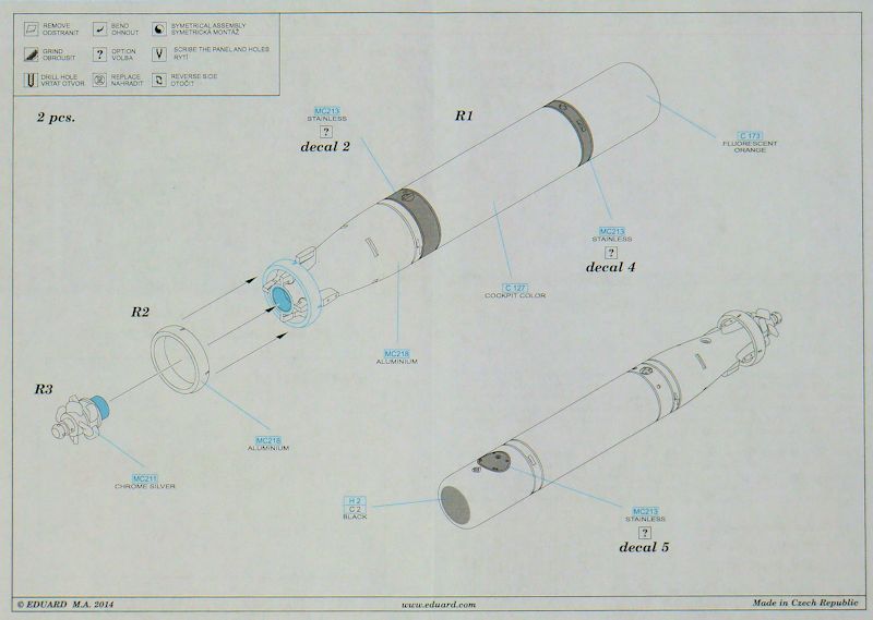 Der Guss ist hervorragend. Beim eigentlichen Torpedokörper ist der Anguss an der "Spitze". Die Farbangaben in der Bauanleitung sind für das GUNZE-System. Es gibt eine schöne mehrfarbige Ansicht als Hilfe.