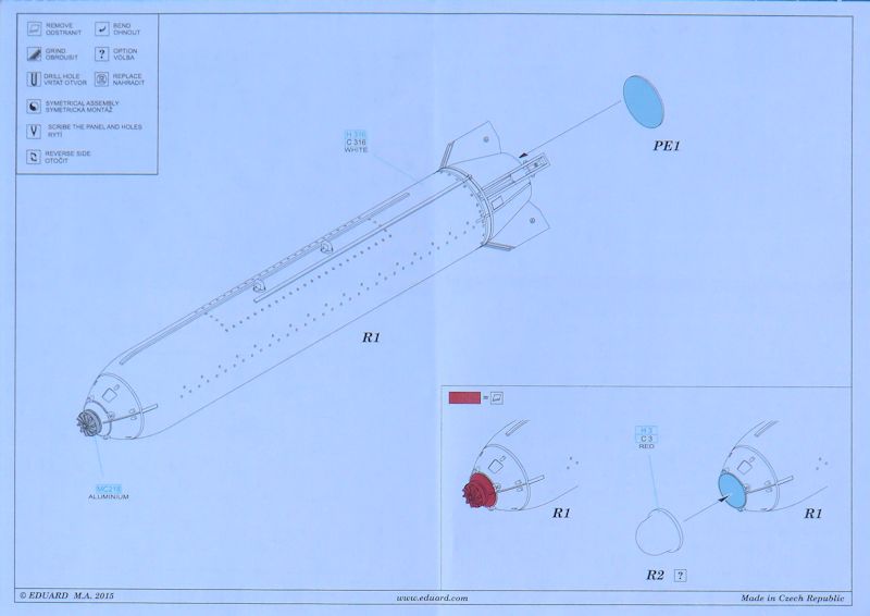Der Guss ist wie immer bei BRASSIN tadellos. Für die Rockeye II müssen die Spitzen der Bomben abgesägt und durch das Resinteil R2 ersetzt werden. Das Fotoätzteil kommt ans Heck der Bombe. Farbhinweise liefert der Hersteller natürlich mit. Eine kleine Skizze zeigt wohin die Decals gehören.