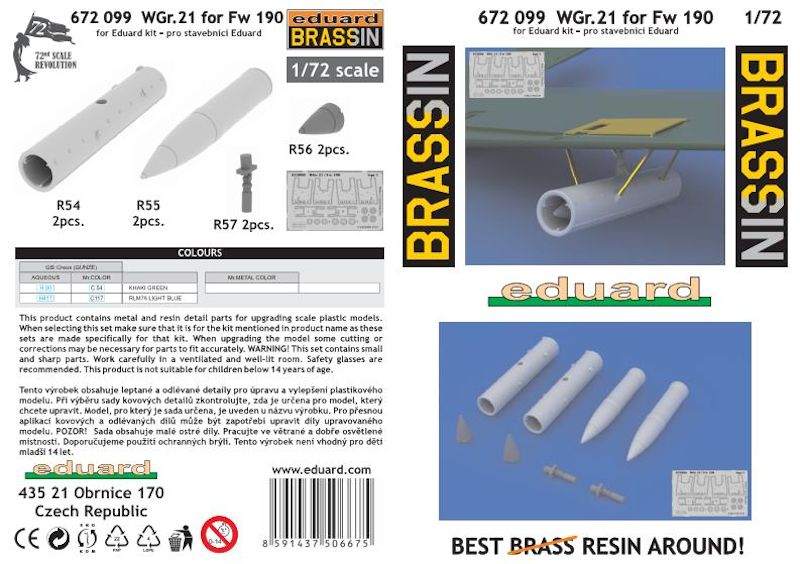 Eduard liefert hier für die hauseigene Fw 190 in 1/72 ein Set mir WGr. 21. In der stabilen durchsichtigen Verpackung befinden sich sehr gut verpackt acht Resinteile, eine Fotoätzplatine sowie die übersichtliche mehrfarbige Bauanleitung.