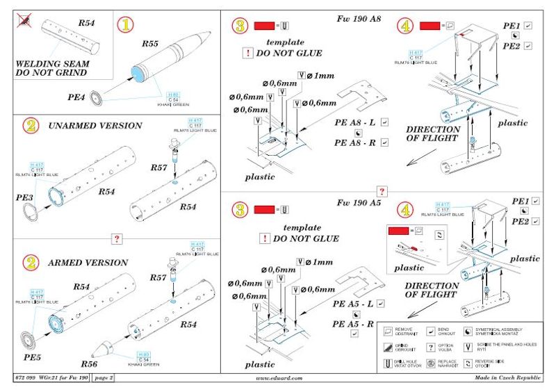 Der Guss ist wie immer bei BRASSIN tadellos. Eduard hat die feinen Unterschiede berücksichtigt. So gibt es das Heckteil des Rohres geschlossen oder geöffnet, je nach Beladungszustand. Beim Bausatz der Fw 190 müssen die geätzen Verstärkungsbleche/Halterungen angebracht werden. Dafür gibt es für die A-5 und die A-8 jeweils zwei passende Bohrschablonen!