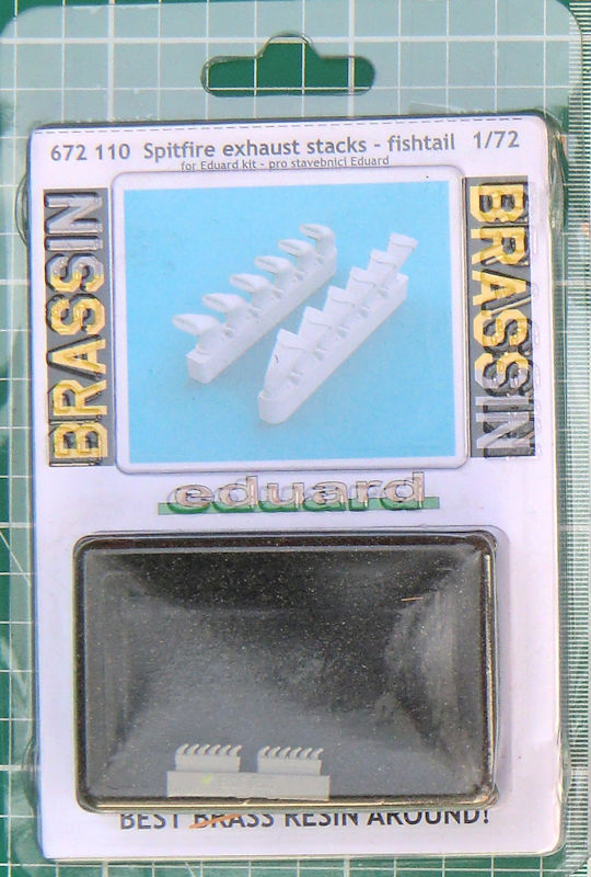 Für die hauseigene Supermarine Spitfire in 1/72 hat eduard in der BRASSIN-Linie ein Set mit neuen Auspuffleisten in der sog. "fishtail-Form" herausgebracht. In der durchsichtigen Verpackung befinden sich gut verpackt zwei Resinteile und eine kleine Bauanleitung.