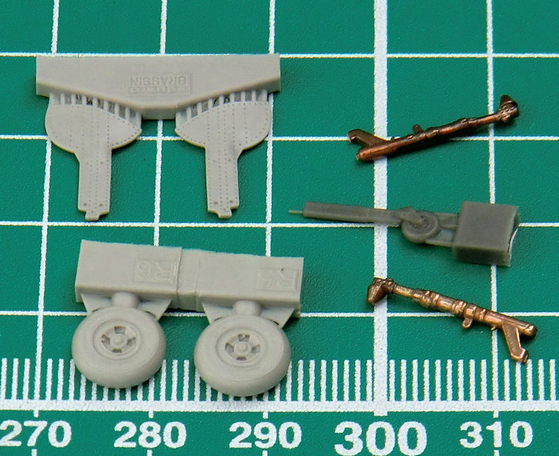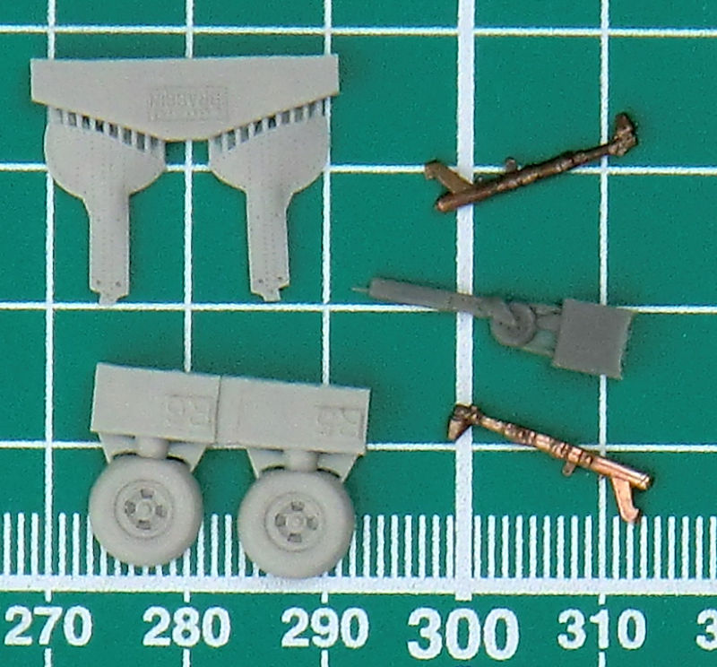 In einer kleinen Bauanleitung wird gezeigt wie diese fünf Resinteile und die Metallteile verarbeitet werden. Mit den vorhandenen gelben Masken lassen sich die beiden Hauptfahrwerksräder abkleben.