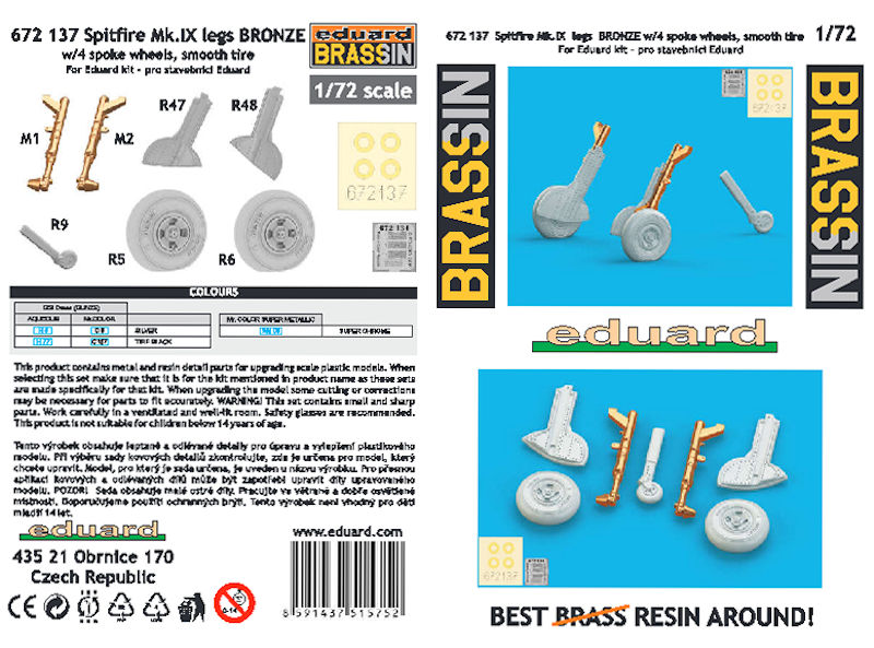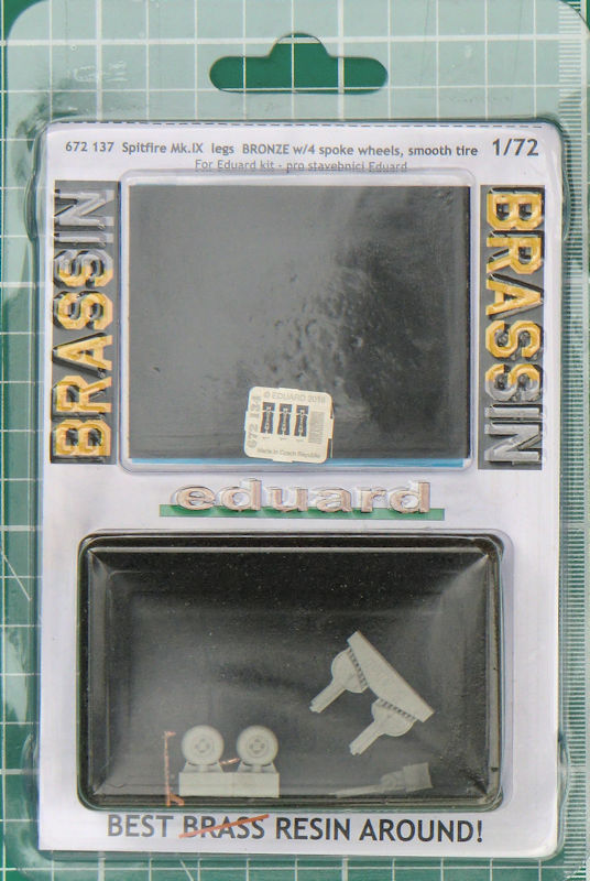 Für die hauseigene Supermarine Spitfire Mk. IX in 1/72 hat eduard in der BRASSIN-Linie ein Set mit neuen Hauptfahrwerksbeinen, Rädern und den passenden Klappen herausgebracht. In der durchsichtigen Verpackung befinden sich gut verpackt fünf Resinteile, zwei gegossene Metallteile, eine kleine Fotoätzteilplatine und eine kleine Bauanleitung.