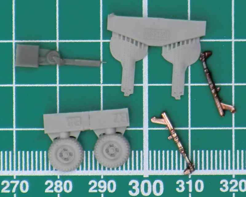 In einer kleinen Bauanleitung wird gezeigt wie diese fünf Resinteile und die Metallteile verarbeitet werden. Mit den vorhandenen gelben Masken lassen sich die beiden Hauptfahrwerksräder maskieren.