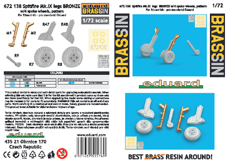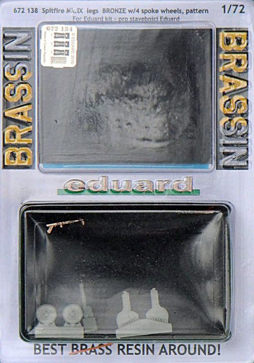 Für die hauseigene Supermarine Spitfire in 1/72 hat eduard in der BRASSIN-Linie ein Set mit neuen Hauptfahrwerksbeinen, Rädern und den passenden Klappen herausgebracht. In der durchsichtigen Verpackung befinden sich gut verpackt fünf Resinteile, zwei gegossene Metallteile, eine kleine Fotoätzteilplatine und eine kleine Bauanleitung.