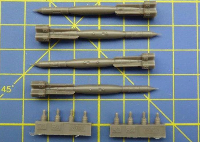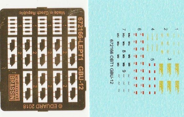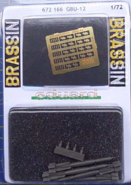 Auch im Maßstab 1/72 versorgt uns Eduard Brassin mit Waffenzubehör (Bomben) für moderne US. Kampfflugzeuge wie hier mit der lasergelenkten Gleitbombe GBU-12. In der typischen durchsichtigen Plastikverpackung befinden sich die vier Bombenkörper, jeweils zwei Varianten von Suchköpfen (eine Version mit Schutzkappen).