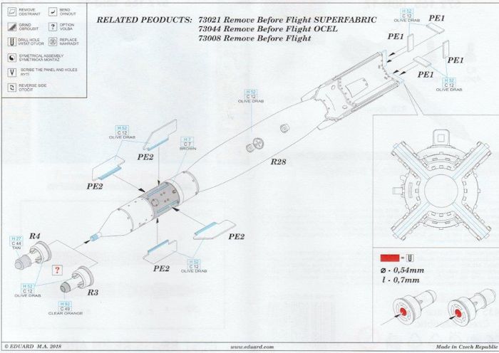 Für die Darstellung der vorderen Stabilisierungsflächen liegt eine messingfarbene Ätzteilplatine bei. Auch PE-Teile für den Heckkonus befinden sich darauf. Die Ätzteile sind sehr filigran was bei dem Maßstab 1/72 nicht verwunderlich ist. Also kann hier ruhige Hand bei der Verarbeitung nicht schaden!p>