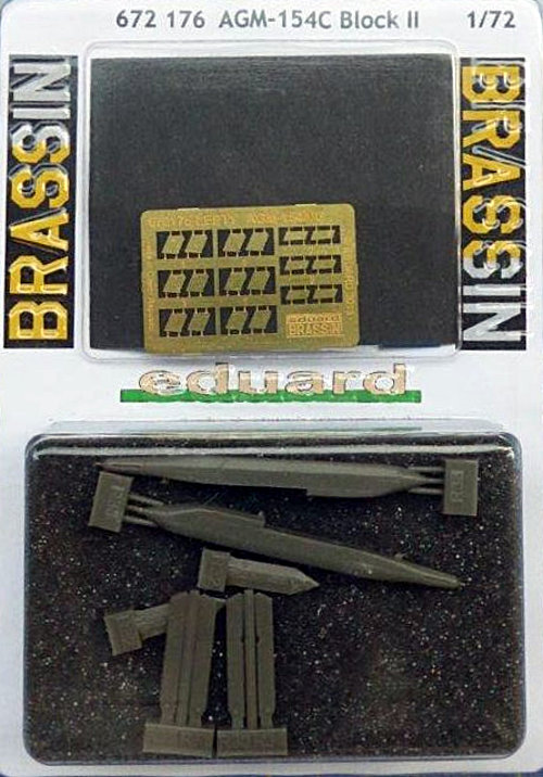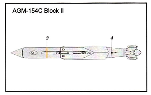Vorbild: Bei der AGM-154 handelt es sich um eine Gleitbombe die per GPS Daten ins Ziel gebracht wird. Die Zieldaten können per Daten link von einer anderen Plattform nach Abwurf der Waffe nachträglich mit neuen Zielkoordinaten versorgt werden. Primäres Merkmal dieser Version ist der Zwei-Weg-Datenlink der es der Waffe ermöglicht bewegliche Boden- und Seeziele besonders effektiv zu bekämpfen. Als primäre Quelle für den nötigen Auftrieb dienen zwei Schwenkflügel, die Lageregelung erfolgt durch vier kleine kreuzförmig angeordnete Flügel am Heck sowie zwei kleine horizontale Kontrollflächen. Die AGM-154C1 Block II wird exklusiv für die US Navy hergestellt. Die Reichweite des Flugkörpers beträgt 100Km.