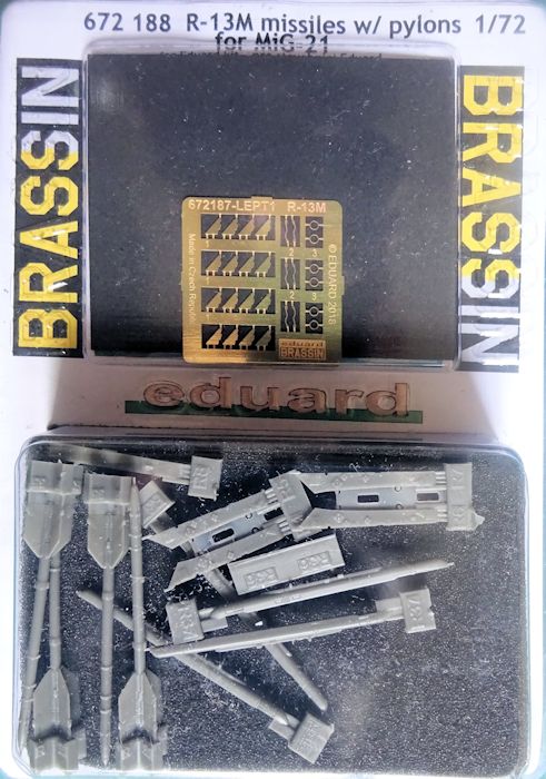 Zeitgleich mit der hauseigenen MiG-21MF erscheinen mehrere Nachrüstsätze in der Brassinreihe. Hier liefert Eduard die je vier R-13M mit den typspezifischen und allgemeinen Trägern. Für die Detailierung gibt es Ätzteile. Ein kleiner Abziehbilderbogen vervollständigt das Set. Bedauerlich sind die zwei bei mir verbogenen Raketen.