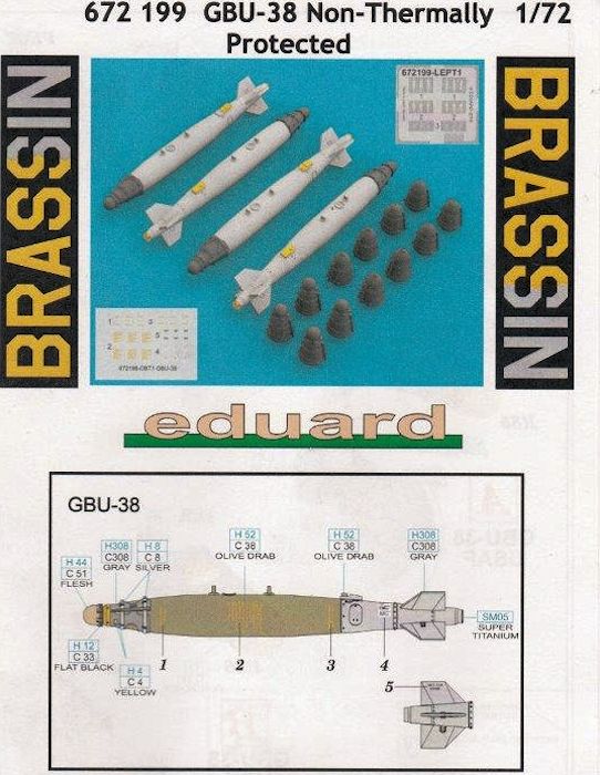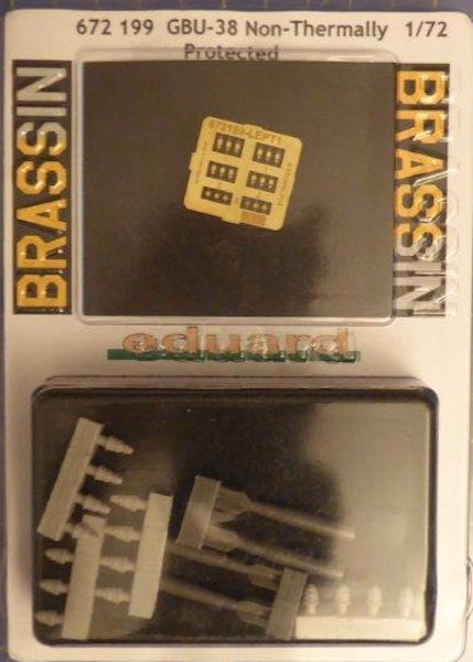 Mit der GBU-38 erweitert eduard Brassin sein reichhaltiges Angebot an modernen Abwurfwaffen im Maßstab 1/72. In der Plastikverpackung befinden sich vier Bombenkörper, und vier unterschiedliche Varianten der Aufschlagzünder. Zwei Versionen der U.S Air Force und derer zwei für die U.S Navy.