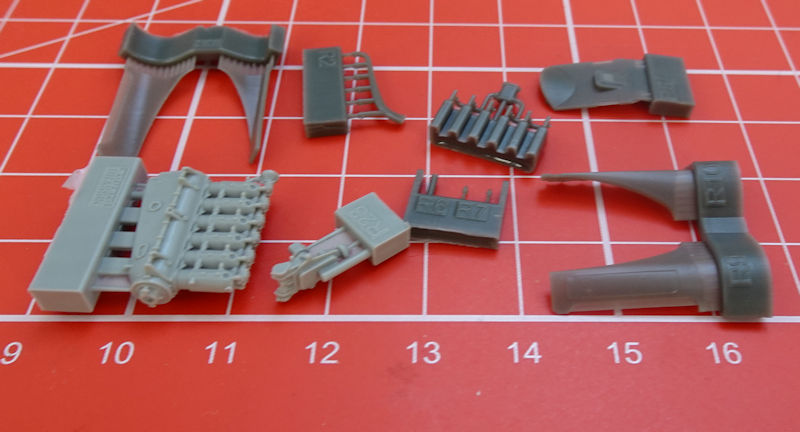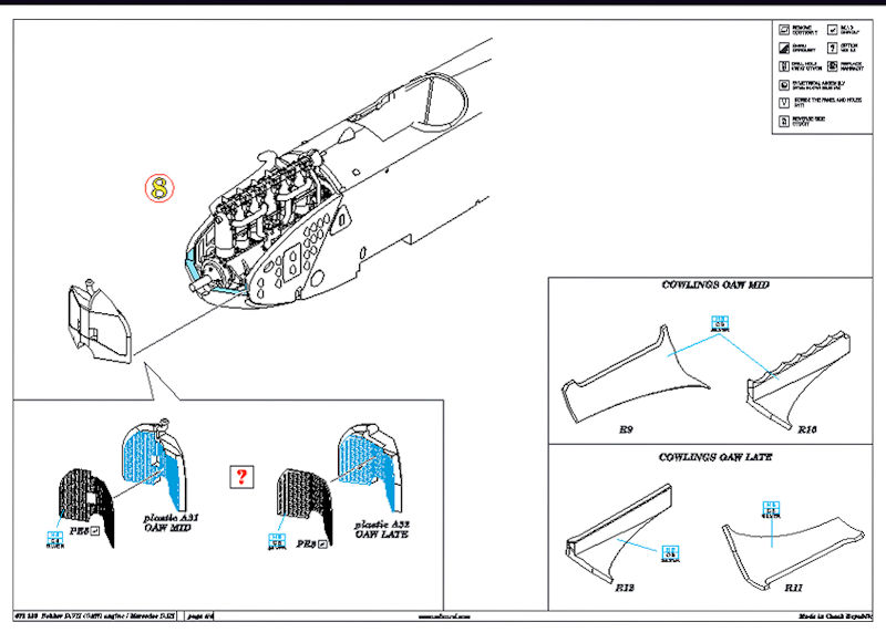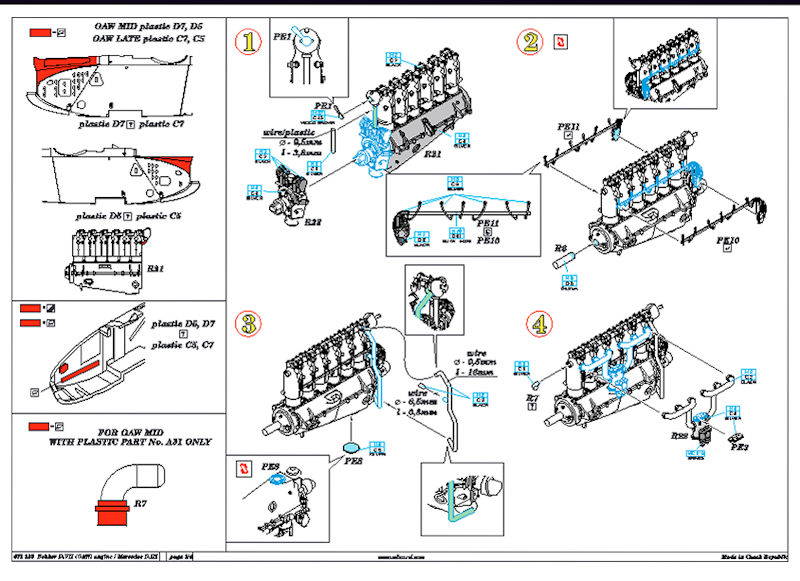 Aus den vorhandenen Teilen lässt sich ein kompletter Mercedes-Motor samt Motorhauben neu erstellen. Es wird nur noch ein wenig Rundmaterial und Draht benötigt. Es gibt auch noch die jeweils passende Motorverkleidung für eine frühe oder späte OAW-Fokker.